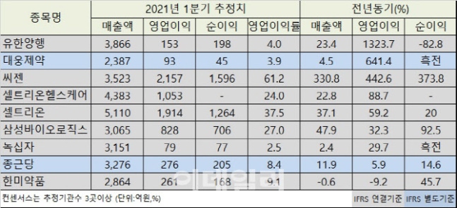 제약·바이오 주요 상장사들의 올해 1분기 실적이 전년보다 증가할 것으로 추정된다. 매출 1위는 지난해 사상 처음 유한양행(000100)을 제치고 1위에 올라섰던 셀트리온(068270)이 차지했다. 한미약품은 코로나19 타격으로 유일하게 전년보다 실적 하락이 관측된다.