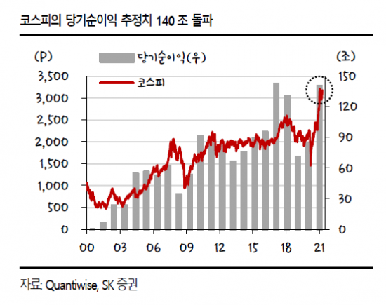 18일 SK증권은 국내외 증시가 본격적으로 실적 장세로 접어들고 있다고 분석했다. 한대훈 SK증권 연구원은 "미국 S&P500 기업들의 1분기 실적은 전년 동기 대비 24.5% 증가할 것으로 예상된다"며 "이는 2018년 3분기(26.1%) 이후 가장 높은 수준"이라고 설명했다. 국내 증시 실적 기대감도 커지고 있다. 올해 코스피 기업들의 당기순이익 추정치는 2017년 이후 처음으로 140조원을 넘어섰다. SK증권이 지난해 전망한 133조원을 이미 웃돌고 있다. 한 연구원은 "현재 주식시장은 유동성 장세에서 실적 중심의 기초여견(펀더멘털) 장세로 넘어가는 과정"이라며 "높아진 실적에 대한 기대감은 SK증권의 주식시장 강세 전망을 뒷받침한다"고 분석했다.
