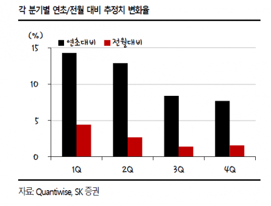 특히 1분기 실적 기대감은 더욱 크다. SK증권은 1분기 코스피 당기순이익을 32조5000억원으로 추정했다. 2018년, 2017년에 이어 역대 세 번째 규모다. 대부분의 업종에서 실적추정치는 상향조정되는 추세다. 이미 1분기 실적추정치는 연초 대비 14.3%, 전월 대비 4.4% 올랐다. 2분기 실적 추정치도 가파르게 상향되고 있다. 한 연구원은 "실적 모멘텀은 하반기보다 상반기에 좋다는 의미"라며 "상반기까지 국내 증시는 상승 흐름을