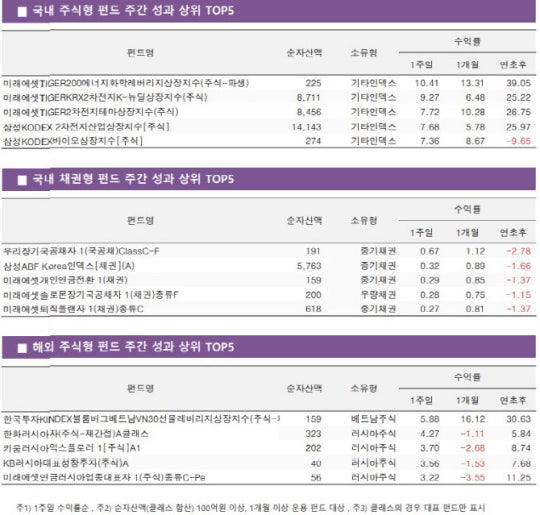 해외 주식형 펀드 평균 주간 수익률은 0.09% 상승을 기록했다. 국가별로는 유럽신흥국주식이 2.51%로 가장 많이 올랐고, 이어 북미주식이 1.22%로 높은 수익률을 기록했다. 인도주식은 3%대 하락했다. 섹터별 펀드에서는 소비재섹터가 2.01% 오르며 선방했다. 개별 상품 중에서는 ‘한국투자KINDEX블룸버그베트남VN30선물레버리지상장지수(주식-파생)’이 5.88%로 가장 우수한 성적을 보였다.