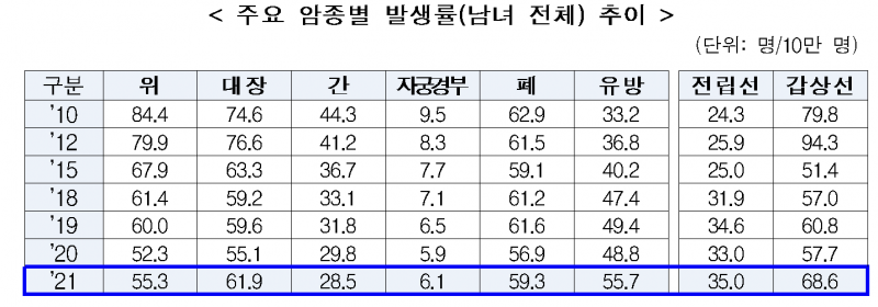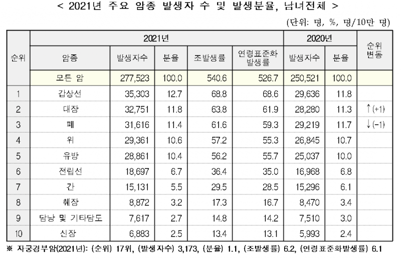 보건복지부(장관 조규홍)와 중앙암등록본부(국립암센터, 원장 서홍관)는 2021년 국가암등록통계(암 발생률, 상대생존율, 유병률 등)를 발표했다.
