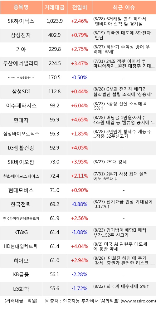 기관 투자자는 28일 거래소에서 SK하이닉스, 삼성전자, 기아 등을 중점적으로 사들인 것으로 나타났다.