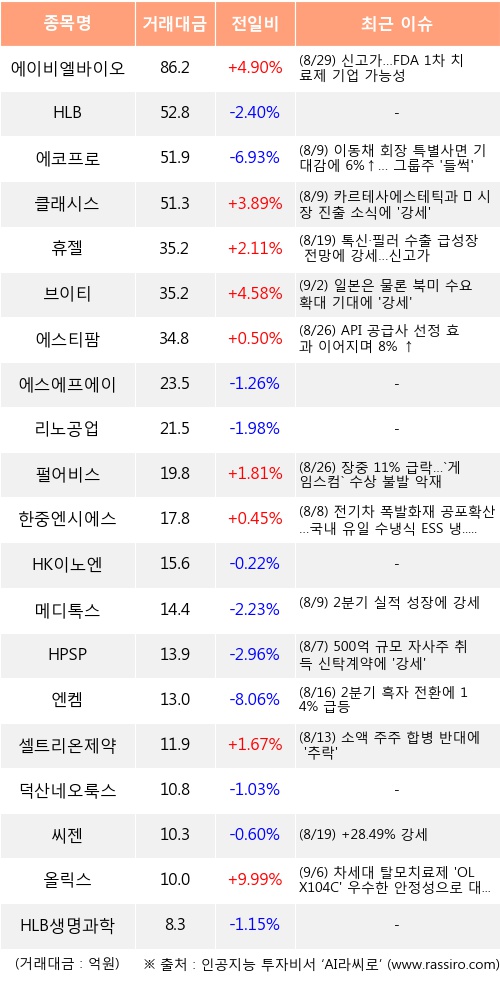 에이비엘바이오, 클래시스, 휴젤 등은 전일 대비 주가가 상승했고, HLB, 에코프로, 에스에프에이 등은 주가가 하락했다.