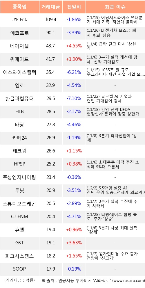 외국인 투자자의 순매수 상위 20개 종목은 JYP Ent., 에코프로, 네이처셀, 위메이드, 에스와이스틸텍, 엠로, 한글과컴퓨터, HLB, 태광, 카페24 등이다.