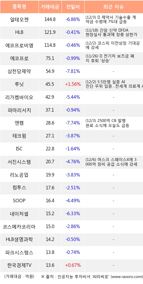 루닛, 한국경제TV 등은 전일 대비 주가가 상승했고, 알테오젠, HLB, 에코프로비엠 등은 주가가 하락했다.