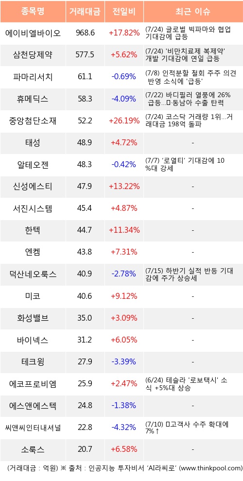 외국인 투자자의 순매수 상위 20개 종목은 에이비엘바이오, 삼천당제약, 파마리서치, 휴메딕스, 중앙첨단소재, 태성, 알테오젠, 신성에스티, 서진시스템, 한텍 등이다.