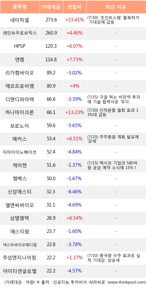 네이처셀, 레인보우로보틱스, HPSP 등은 전일 대비 주가가 상승했고, 리가켐바이오, 디앤디파마텍, 보로노이 등은 주가가 하락했다.