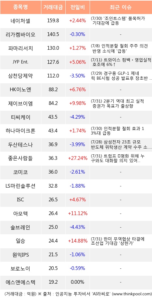 네이처셀, 파마리서치, JYP Ent. 등은 전일 대비 주가가 상승했고, 리가켐바이오, 삼천당제약, 티씨케이 등은 주가가 하락했다.