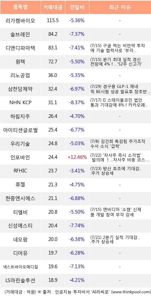 인포바인 등은 전일 대비 주가가 상승했고, 리가켐바이오, 솔브레인, 디앤디파마텍 등은 주가가 하락했다.