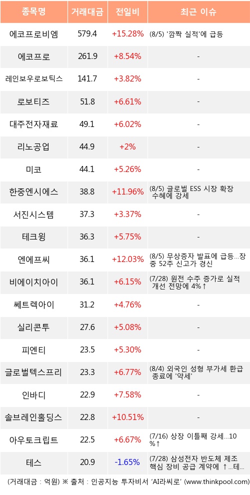 에코프로비엠, 에코프로, 레인보우로보틱스 등은 전일 대비 주가가 상승했고, 테스 등은 주가가 하락했다.