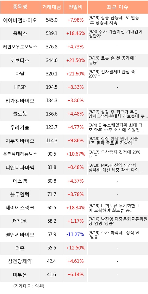 외국인 투자자의 순매수 상위 20개 종목은 에이비엘바이오, 올릭스, 레인보우로보틱스, 로보티즈, 다날, HPSP, 리가켐바이오, 클로봇, 우리기술, 지투지바이오 등이다.