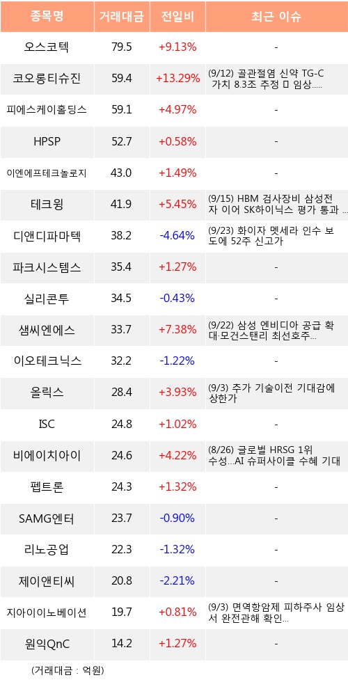 [09월23일]코스닥 기관 순매수 상위 종목※ HPSP에 대한 속보, 주요공시, 특이사항 더보기 ▶