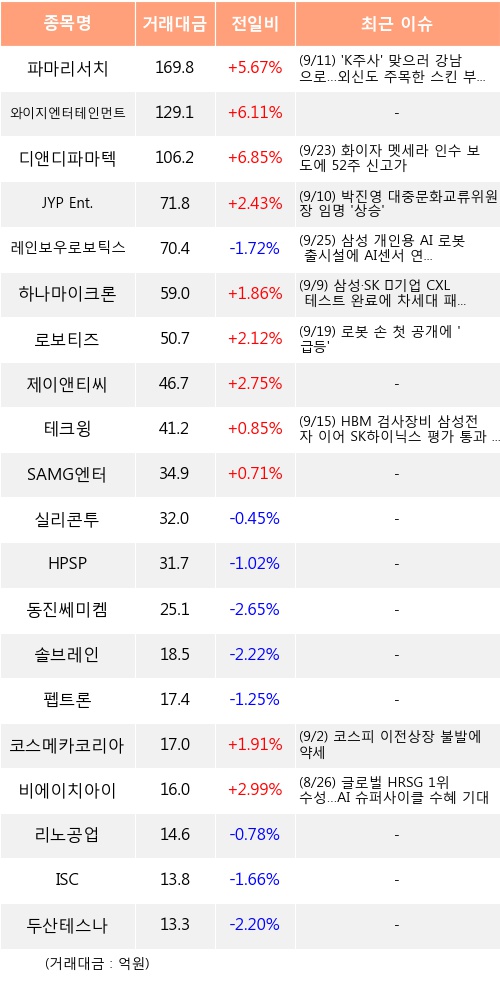파마리서치, 와이지엔터테인먼트, 디앤디파마텍 등은 전일 대비 주가가 상승했고, 레인보우로보틱스, 실리콘투, HPSP 등은 주가가 하락했다.