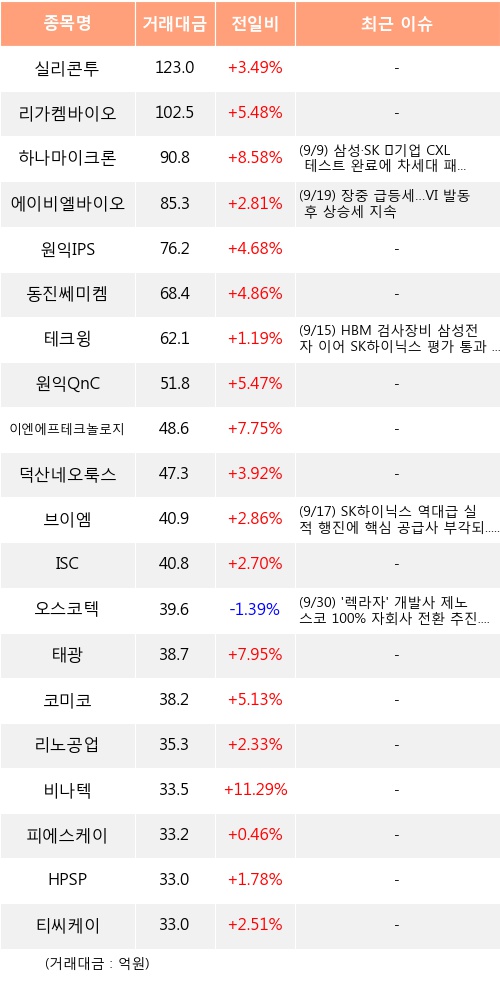 기관 투자자의 순매수 상위 20개 종목은 실리콘투, 리가켐바이오, 하나마이크론, 에이비엘바이오, 원익IPS, 동진쎄미켐, 테크윙, 원익QnC, 이엔에프테크놀로지, 덕산네오룩스 등이다.