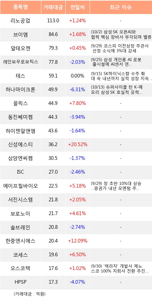 리노공업, 브이엠, 알테오젠 등은 전일 대비 주가가 상승했고, 레인보우로보틱스, 하나마이크론, 동진쎄미켐 등은 주가가 하락했다.