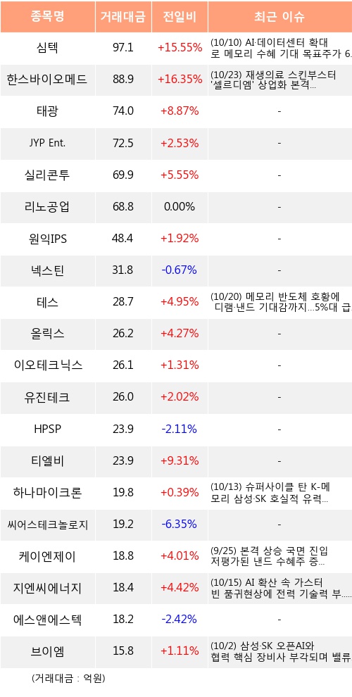 기관 투자자의 순매수 상위 20개 종목은 심텍, 한스바이오메드, 태광, JYP Ent., 실리콘투, 리노공업, 원익IPS, 넥스틴, 테스, 올릭스 등이다.