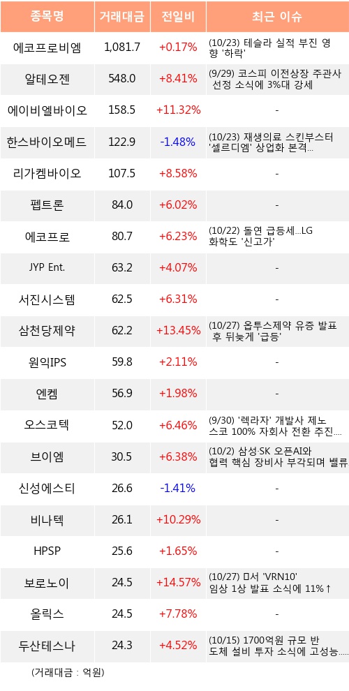 에코프로비엠, 알테오젠, 에이비엘바이오 등은 전일 대비 주가가 상승했고, 한스바이오메드, 신성에스티 등은 주가가 하락했다.