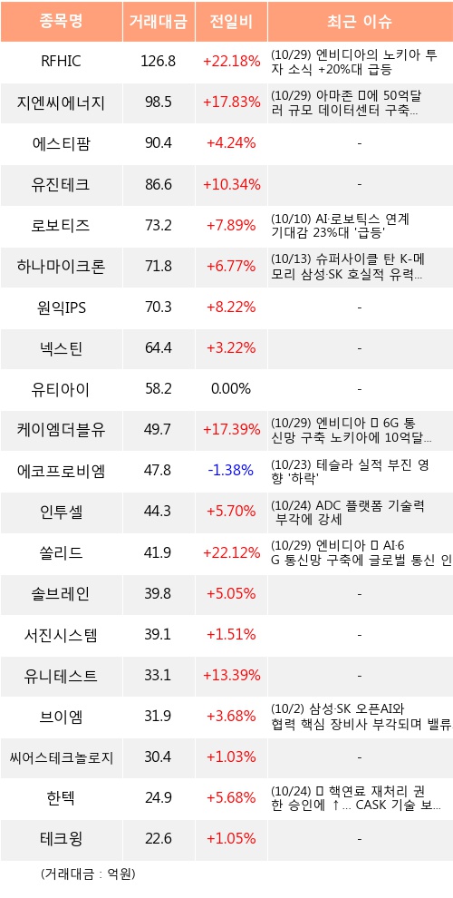 기관 투자자는 29일 코스닥에서 RFHIC, 지엔씨에너지, 에스티팜 등을 중점적으로 사들인 것으로 나타났다.