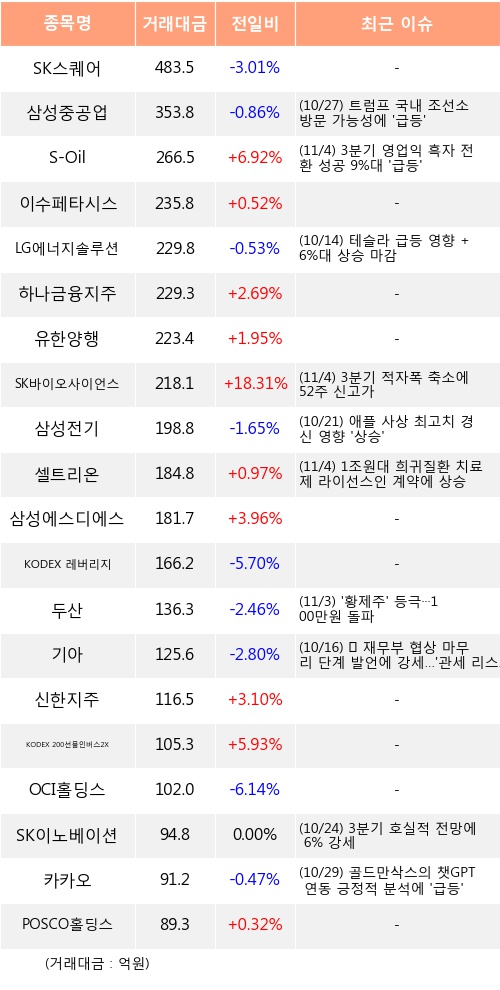 S-Oil, 이수페타시스, 하나금융지주 등은 전일 대비 주가가 상승했고, SK스퀘어, 삼성중공업, LG에너지솔루션 등은 주가가 하락했다.