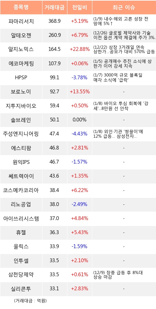파마리서치, 알테오젠, 알지노믹스 등은 전일 대비 주가가 상승했고, HPSP, 주성엔지니어링, 원익IPS 등은 주가가 하락했다.