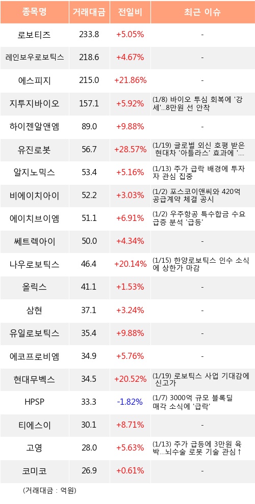 기관 투자자의 순매수 상위 20개 종목은 로보티즈, 레인보우로보틱스, 에스피지, 지투지바이오, 하이젠알앤엠, 유진로봇, 알지노믹스, 비에이치아이, 에이치브이엠, 쎄트렉아이 등이다.