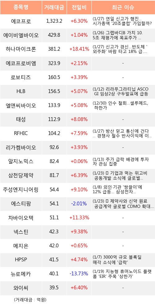 에코프로, 에이비엘바이오, 하나마이크론 등은 전일 대비 주가가 상승했고, 에스티팜, 뉴로메카 등은 주가가 하락했다.