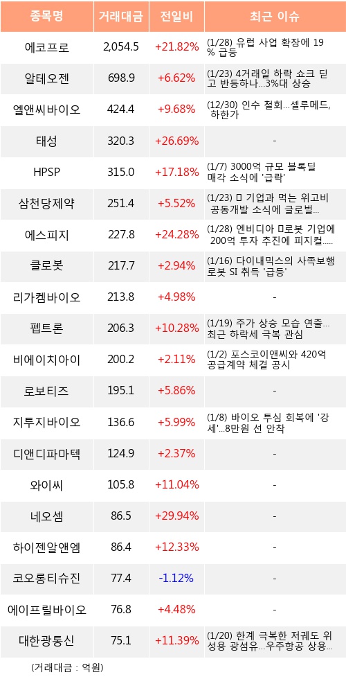에코프로, 알테오젠, 엘앤씨바이오 등은 전일 대비 주가가 상승했고, 코오롱티슈진 등은 주가가 하락했다.