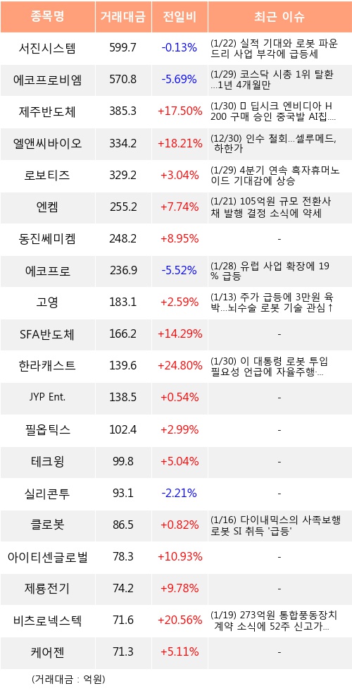 [01월30일]코스닥 외국인 순매수 상위 종목※ 서진시스템에 대한 속보, 주요공시, 특이사항 더보기 ▶