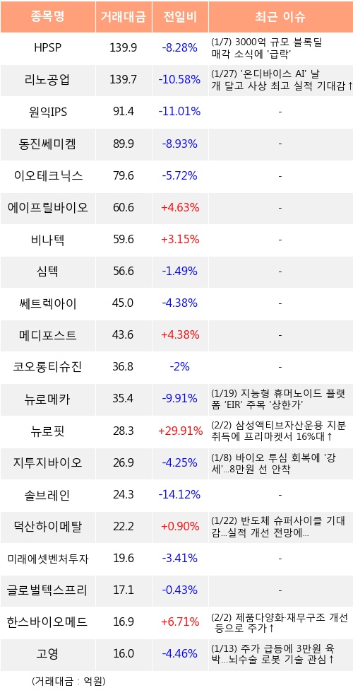[02월02일]코스닥 기관 순매수 상위 종목※ HPSP에 대한 속보, 주요공시, 특이사항 더보기 ▶