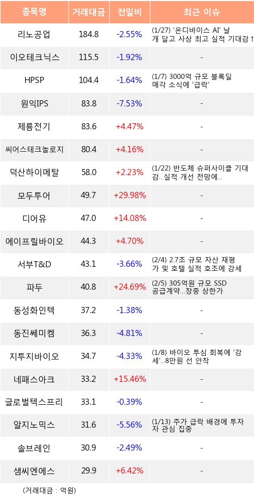 [02월05일]코스닥 기관 순매수 상위 종목※ HPSP에 대한 속보, 주요공시, 특이사항 더보기 ▶