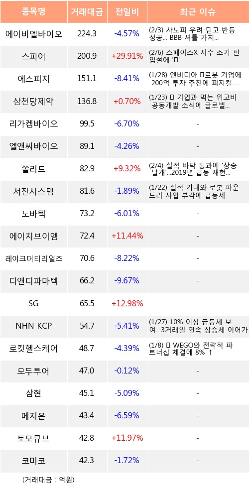 스피어, 삼천당제약, 쏠리드 등은 전일 대비 주가가 상승했고, 에이비엘바이오, 에스피지, 리가켐바이오 등은 주가가 하락했다.