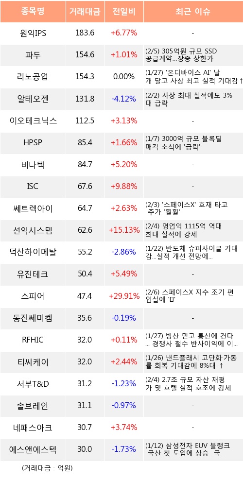 기관 투자자는 06일 코스닥에서 원익IPS, 파두, 리노공업 등을 중점적으로 사들인 것으로 나타났다.