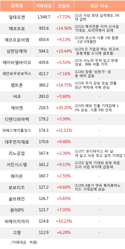 기관 투자자의 순매수 상위 20개 종목은 알테오젠, 에코프로, 에코프로비엠, 삼천당제약, 에이비엘바이오, 레인보우로보틱스, 펩트론, HLB, 케어젠, 디앤디파마텍 등이다.