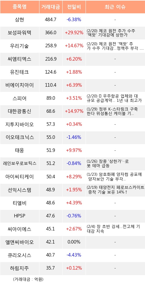 외국인 투자자의 순매수 상위 20개 종목은 삼현, 보성파워텍, 우리기술, 씨엠티엑스, 유진테크, 비에이치아이, 스피어, 대한광통신, 지투지바이오, 이오테크닉스 등이다.