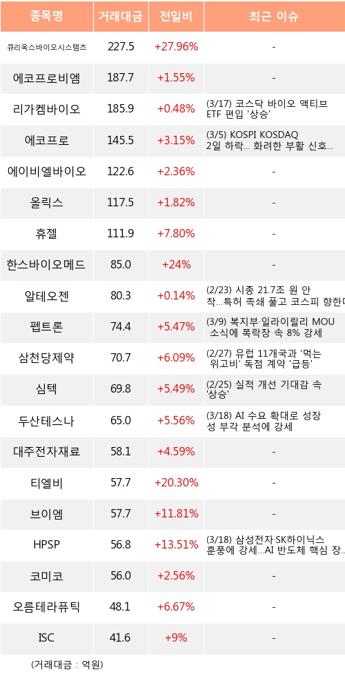 [03월18일]코스닥 기관 순매수 상위 종목※ HPSP에 대한 속보, 주요공시, 특이사항 더보기 ▶
