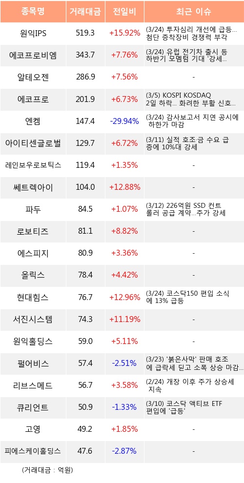 [03월24일]코스닥 외국인 순매수 상위 종목※ 서진시스템에 대한 속보, 주요공시, 특이사항 더보기 ▶