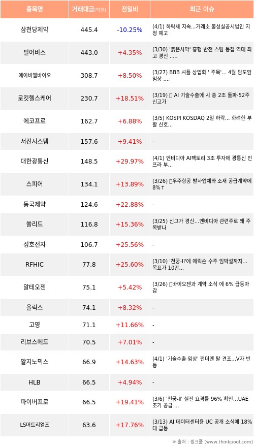 [04월01일]코스닥 외국인 순매수 상위 종목※ 서진시스템에 대한 속보, 주요공시, 특이사항 더보기 ▶