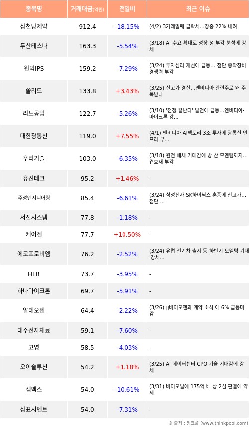 쏠리드, 대한광통신, 유진테크 등은 전일 대비 주가가 상승했고, 삼천당제약, 두산테스나, 원익IPS 등은 주가가 하락했다.