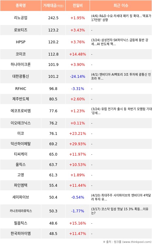 리노공업, 로보티즈, HPSP 등은 전일 대비 주가가 상승했고, 대한광통신, RFHIC, 세미파이브 등은 주가가 하락했다.